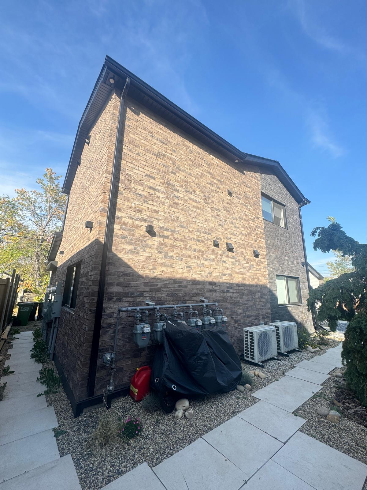 Met Exteriors completed another exterior thin brick veneer project using a combination of black and brown traditional thin brick. The materials were supplied and professionally installed by Met Exteriors, delivering a durable and visually balanced exterior brick finish.