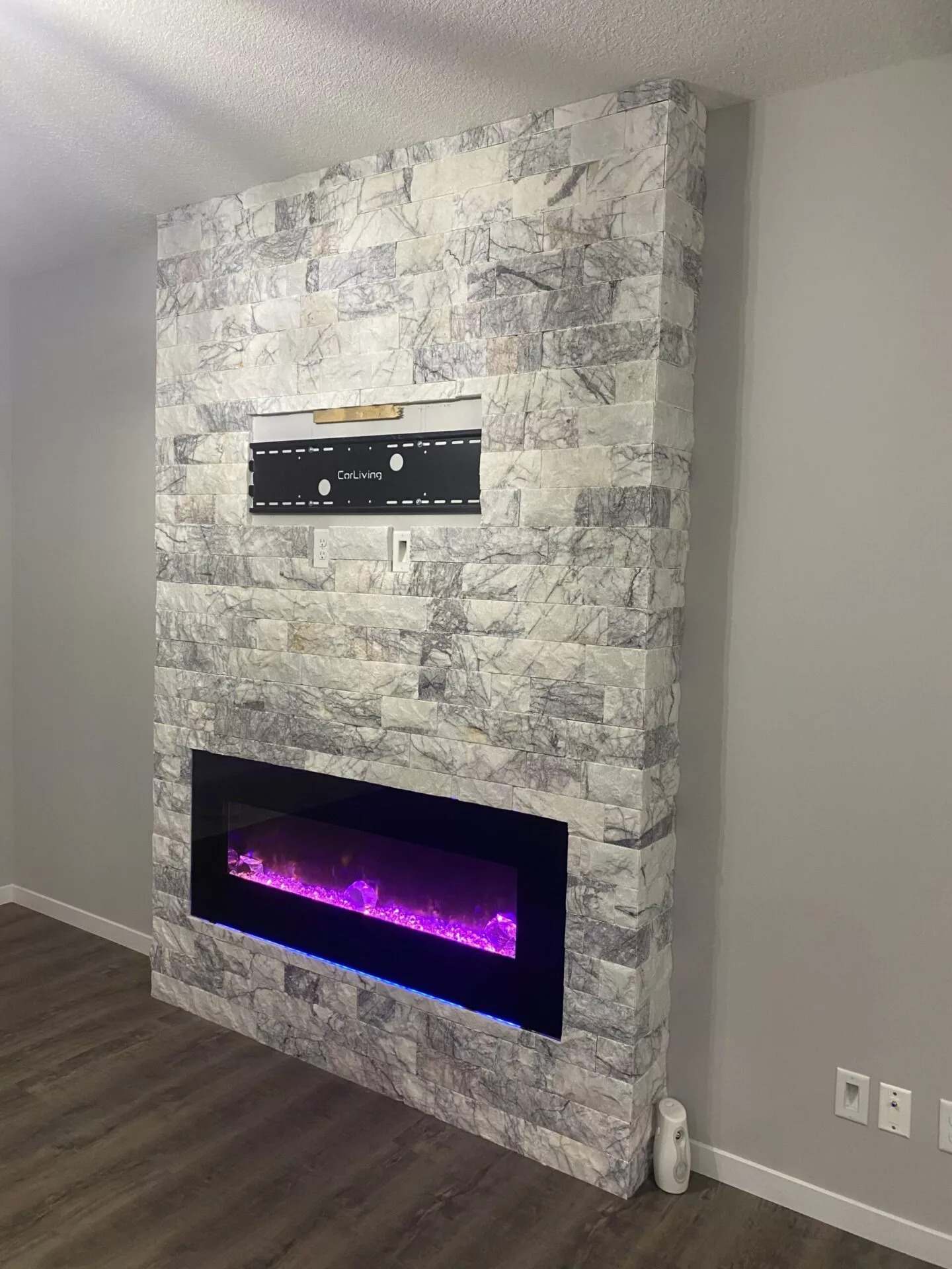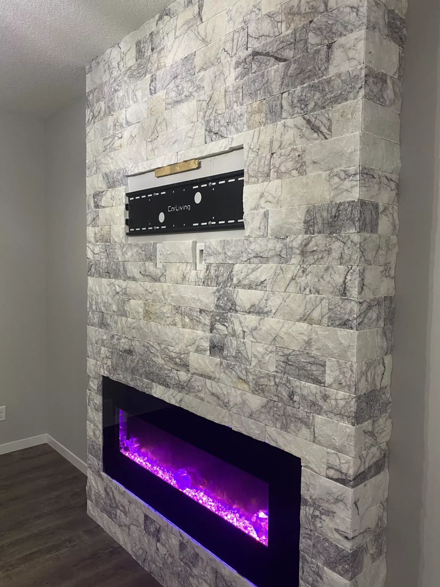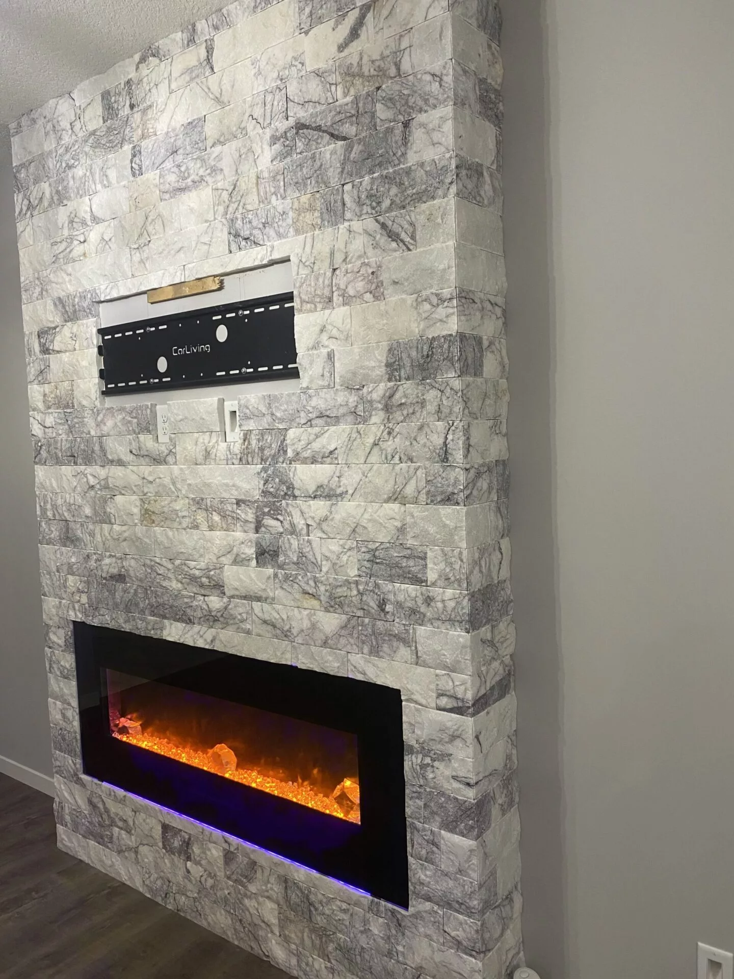 Met Exteriors created this stunning interior stone feature wall to bring warmth and elegance to the space. Using premium natural stone veneer, our team handcrafted a seamless design that highlights the beauty and texture of real stone.